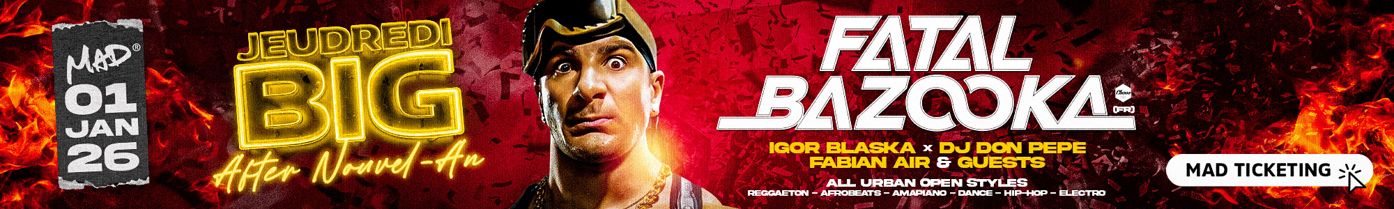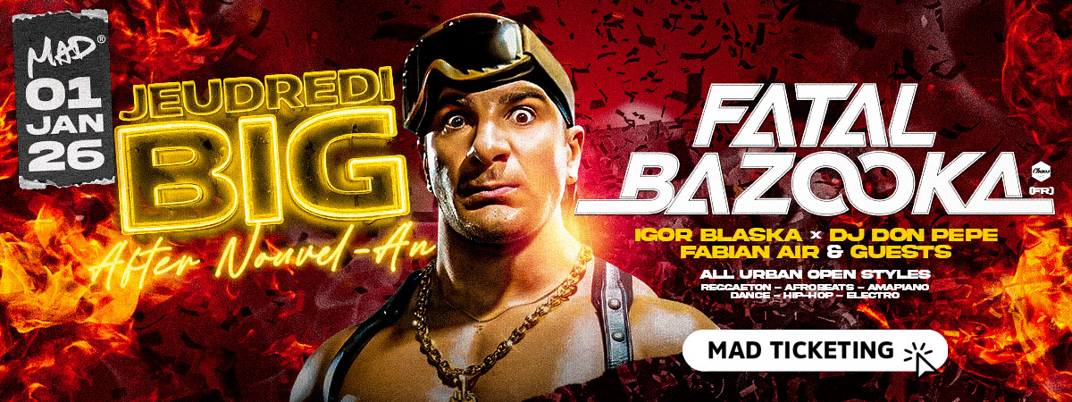 Cette semaine, de jeudi à dimanche, on vous réserve tout ce que vous kiffez au MAD Club : Une Jeudredi BIG pour bien s’échauffer, une Hip Hop Party XXL avec Stone (Paris) et Ravage (Lyon), et une Machine qui fait POP (vendredi). Puis, place à la MAD in Reggaeton et à la Sweet Love by Golden Vibes (samedi). Be MAD !