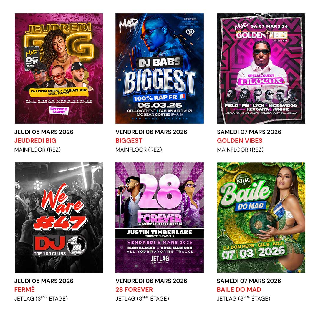 Les super soirées bourgeonnent au MAD Club cette semaine, de mercredi (Stormy White Lies) à dimanche (Gameboy). C’est le mois de mars ! Au menu, très printanier sur le main : Jeudredi BIG, Biggest (vendredi) et Lilocox (P) à la Golden Vibes (samedi). Avec un crochet par le JETLAG pour un Justin Timberlake Tribute Show à la 28 Forever (vendredi). Be MAD !