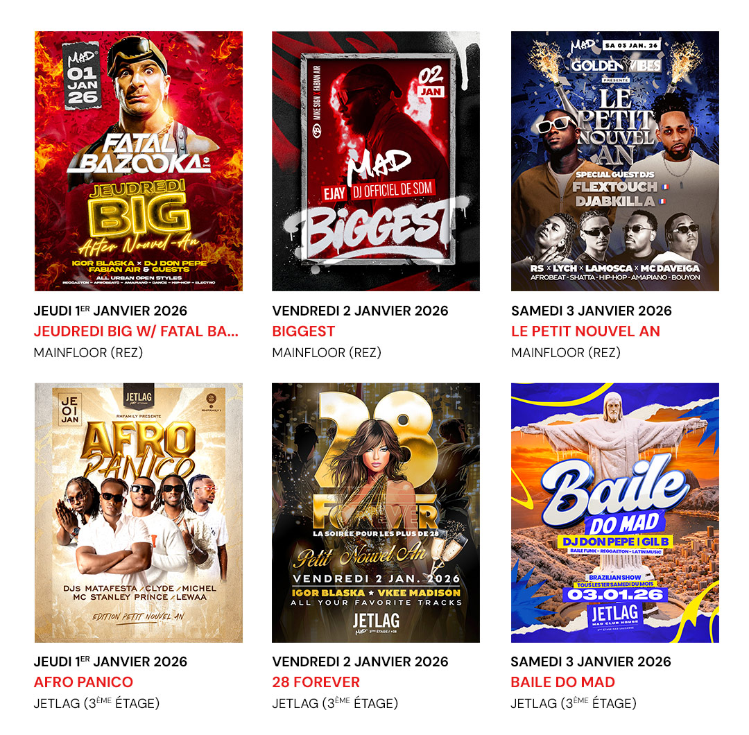 Prêts pour une nouvelle année de folie ? On commence par enterrer 2025 mercredi avec une Bordello Big MAD Gay Party sur le Mainfloor, et un Afro New Year by Golden Vibes au JETLAG. Puis place à 2026 sur le Mainfloor, avec jeudi 1er janvier Michael « Fatal Bazooka » Youn en live showcase déjanté (dress code : fous ta cagoule), The Biggest Hip-Hop Party vendredi, et un Petit Nouvel An avec Flextouch (F) & DJ Djabkilla (F) samedi. Toute l’équipe du MAD vous souhaite la plus madienne des années !
