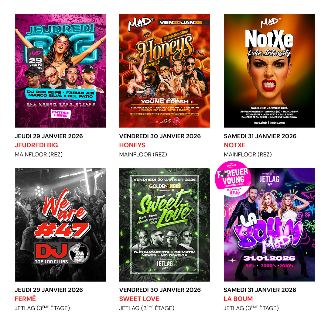 Janvier vit ses derniers jours sur les floors du MAD Club, de jeudi (Jeudredi BIG) à dimanche (Gameboy). Au menu sur le mainfloor : l’immersive show Honeys vendredi, avec en special guest Young Fresh (B), et une NotXe en mode Latin Intensity samedi. Music sounds better with you. Be MAD !