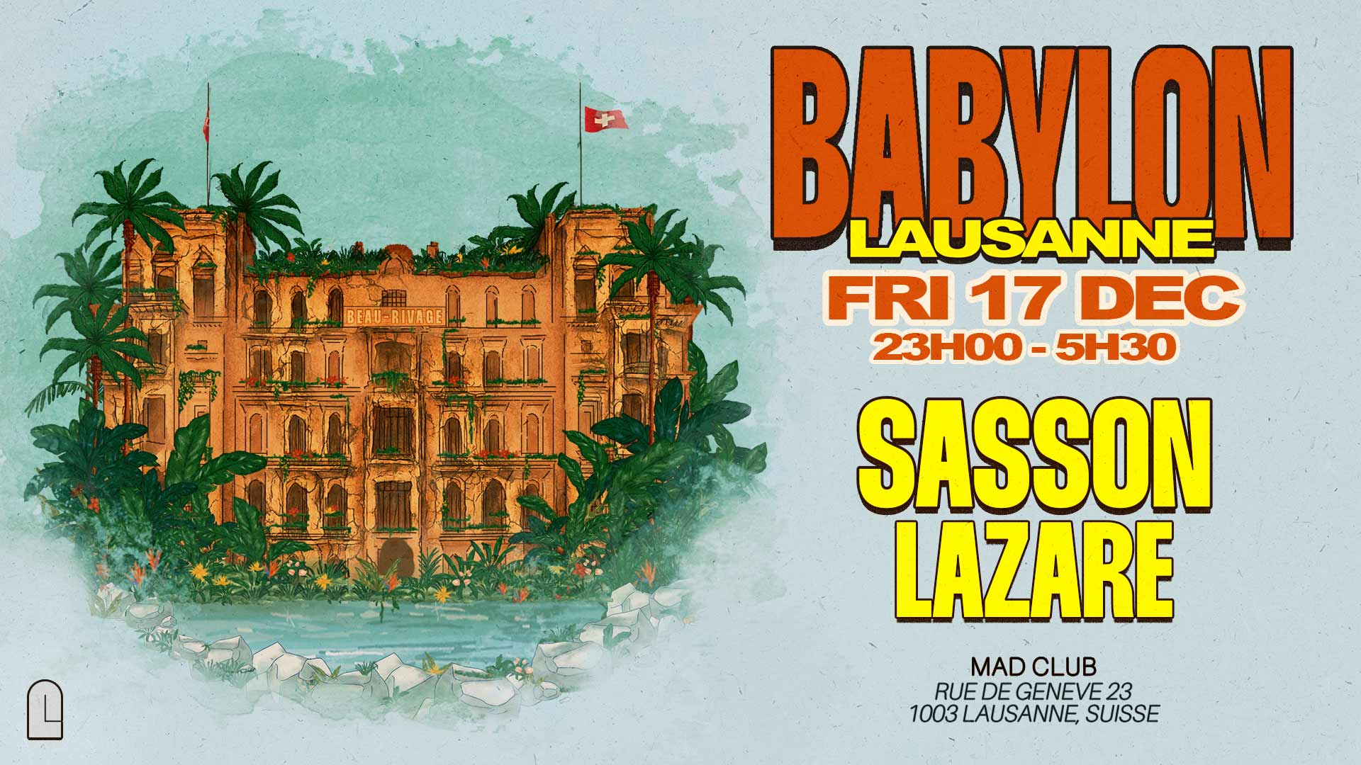 La soirée Babylon, où la créativité rencontre la house music, revient au MAD Club avec Sasson (F) en special guest. Explorateur sonore et globe-trotter des platines, Sasson s’impose comme un pilier de la scène électronique internationale, enchaînant les tournées mondiales et les résidences Bâzâr. Ce soir, il est épaulé par Lazare (F), la nouvelle pépite des dancefloors, au style mêlant électro, house et afro. Be MAD !
