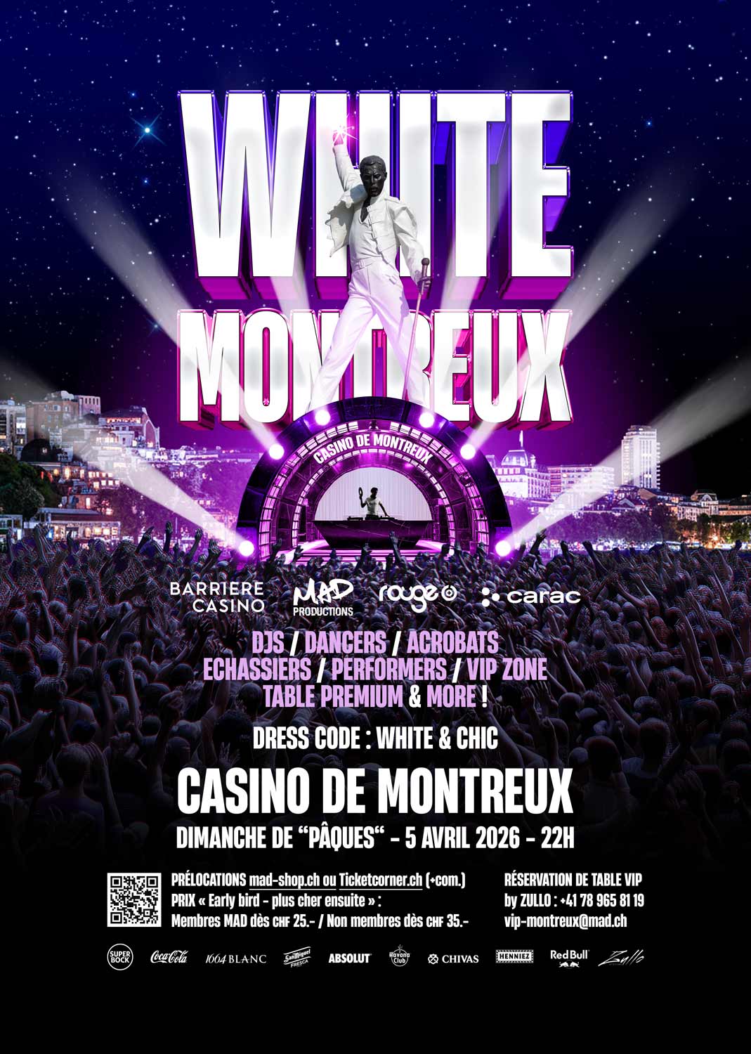 Pour Pâques, le MAD Club et Barrière Casino présentent la White Montreux le dimanche 5 avril 2026 dès 22h. Une soirée blanche exceptionnelle, digne des mythiques nuits de Saint-Tropez, mêlant classe et élégance. Au programme : des DJs, des acrobates, des échassiers, des danseurs et de multiples performers. Et vous savez quoi ? Vous pouvez profiter de cette soirée jusqu’au bout de la nuit : le lendemain, c’est encore Pâques et c’est congé !