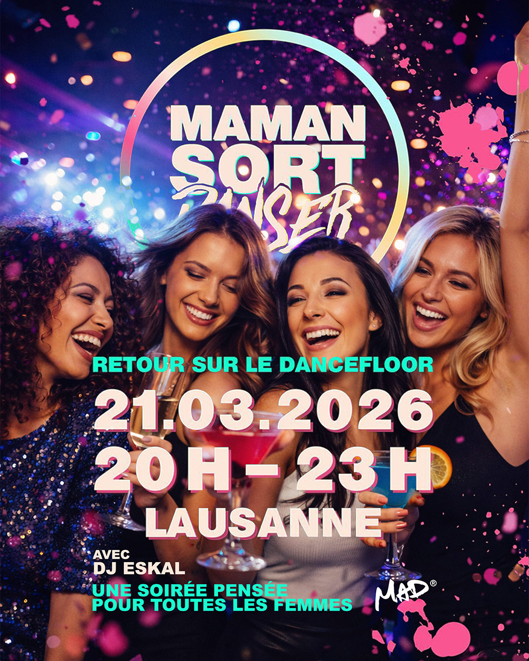 Les soirées MAMAN SORT DANSER au MAD sont un rendez-vous régulier 100 % féminin, pensé pour toutes les femmes qui veulent souffler et retrouver le sens de la fête sans devoir attendre minuit.